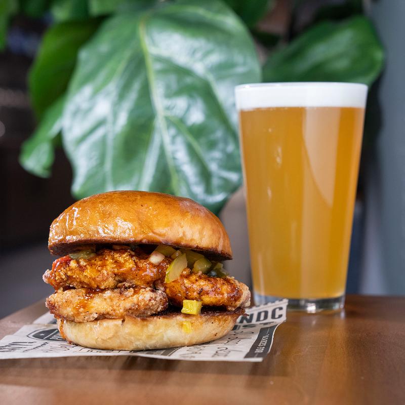 1 Slider $6.00 | Full Size $11.00 • Crispy chicken smothered in hot honey butter, topped with pickle relish on a toasted brioche bun.