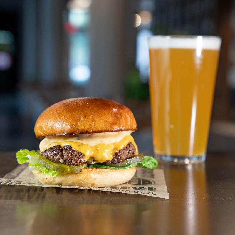 1 Slider $6.00 | Full Size $11.00 • Grilled beef patty dressed with shredded lettuce, American cheese, pickle, and our secret sauce on a toasted brioche bun.